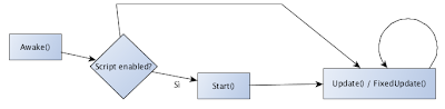 Leggendo da destra a sinistra avremo: inizialmente viene eseguito quanto contenuto nel blocco di codice dello script Awake() (risveglio), e subito dopo se lo script è abilitato si esegue il blocco Start() per ulteriori inizializzazioni. Alla fine si passa alla fase di Update(), che viene eseguita per ogni singolo frame del gioco (quindi a velocità molto elevata), oppure LateUpdate che viene invece ripetuta ogni secondo fisico.