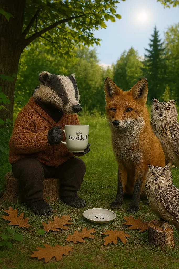 Per questo test abbiamo voluto essere creativi e nostalgici chiedendo di mostrarci un tasso che beve del the, seduto su un ceppo, al tramonto con uno stile che ricordasse Le Avventure di Bosco Piccolo. Poi abbiamo deciso di modificare la vegetazione sullo sfondo, cambiare l’ora del giorno ed aggiungere una volpe al fianco del tasso. Ed infine, abbiamo deciso di mostrare l’immagine come se fosse stata scattata nella realtà. Poi non contenti abbiamo voluto testare la capacità del modello di aggiungere nuovi elementi da un’immagine fornita, in questo caso un simpatico gufo.