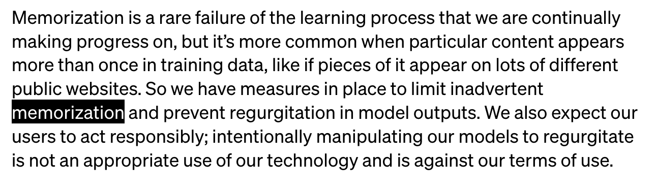 Si potrebbe pensare che le misure che sta prendendo OpenAI (sostanzialmente in corso d’opera, forse in fase di sviluppo o ancora parzialmente attive) servano a bilanciare casi di questo tipo, intendendo così la regurgitation (parola che non sembra comparire nella letteratura deep learning) come riproposizione indebita di dati di addestramento di cui l’algoritmo ha abusato (ha fatto una “scorpacciata”). Ecco perchè rigurgito è la parola scelta, probabilmente, anche se sembra un termine forte: perchè è quello che succede quando l’addestramento è troppo localizzato e, a livello interno, viene malamente metabolizzato, con risultato di alterare la percezione ed in meccanismi di induzione della macchina stessa. “Manipolare intenzionalmente i nostri modelli per rigurgitarli“, aspetto ancora più interessante citato dall’azienda, “non è un uso appropriato della nostra tecnologia ed è contrario ai nostri termini di utilizzo“: non possiamo, quindi, “far ubriacare” ChatGPT tanto per divertirci.