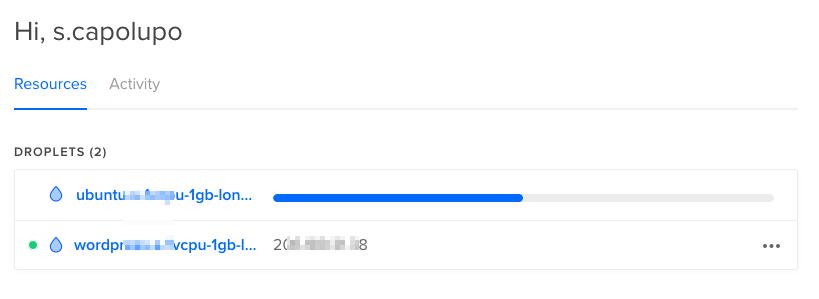 Nell’esempio successivo, come esempio ulteriore, possiamo vedere due droplet (una in corso di creazione al momento della screenshot), in cui vediamo nell’ordine il nome (cliccabile per info), l’indirizzo IP (basta passare sopra col mouse e cliccare per selezionarlo) ed i tre puntini sospensivi per accedere alle opzioni: