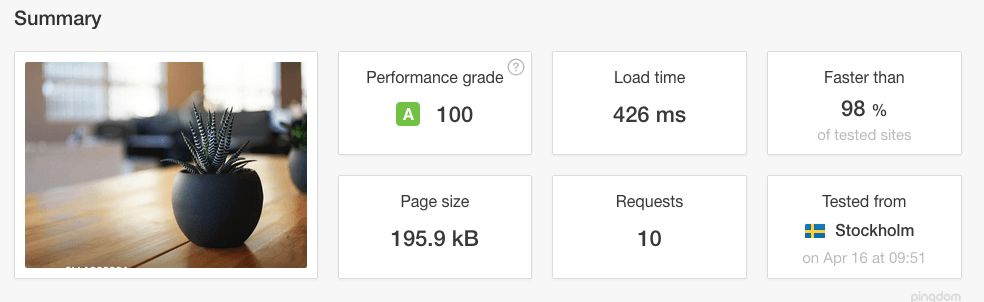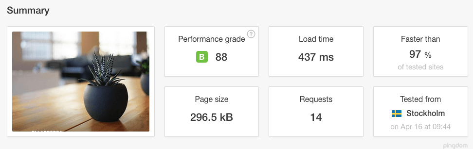 Le prestazioni su un’installazione “nuda” di WordPress parlano abbastanza chiare, del resto (il benchmark è quello di Pingdom): questo è il benchmark effettuato sulla prima installazione con il tema di default e privo di plugin.