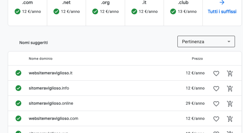 Basta inserire il nome desiderato nella barra di ricerca e il sistema ti dirà se è disponibile o meno. Se il dominio è già registrato da qualcun altro, potrebbero comparire suggerimenti alternativi.